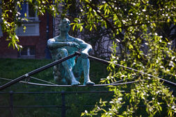 The Rower (At the Finish Line) is an emanation of lightness in a blue form carrying both essential and weighty messages of substance and ideology – he is one of the modern heroes of sport, who not only swims but also floats above the waterway. The formal, artistic, and balancing essence of the design is the figure's significant deflection beyond the rope's outline. This is another design challenge the artist imposed on himself, revealing a different kind of movement and gravity. Bringing the composition closer to the water's surface enriches the composition's formal play with mirror reflections in the depths and sunlight cast from the waves onto the sculpture's details. Structural difficulties did not prevent the artist from rendering the rower with the finesse and lightness of sculptural craftsmanship. It is a story about striving for harmony and maintaining a precarious balance – in life and in art. Because it is such a quiet proposition, balancing between activity and peace, between the history of the city and the new path of art, the perfect escape from a gray day in the city center.